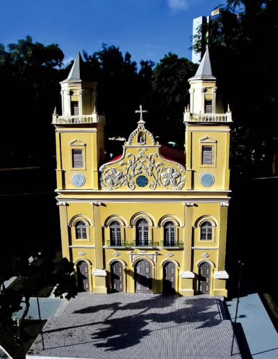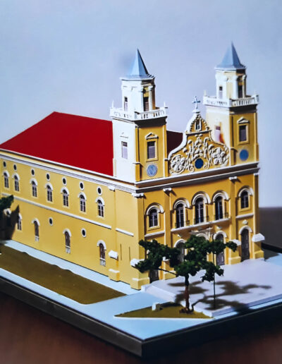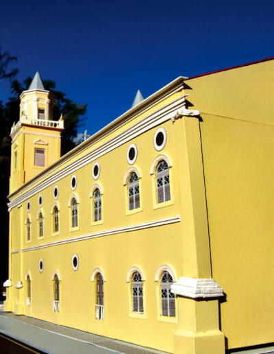Sem um projeto arquitetônico disponível, foi necessário realizar medições e capturas fotográficas in loco para a criação do modelo. Todos os detalhes em alto relevo foram moldados manualmente com massa epóxi, em uma época em que impressoras 3D ainda eram raras e pouco acessíveis.