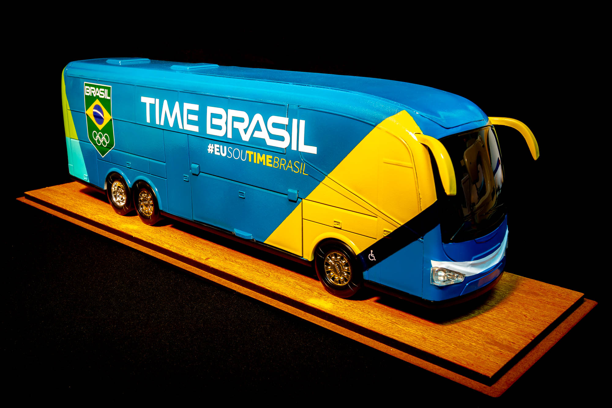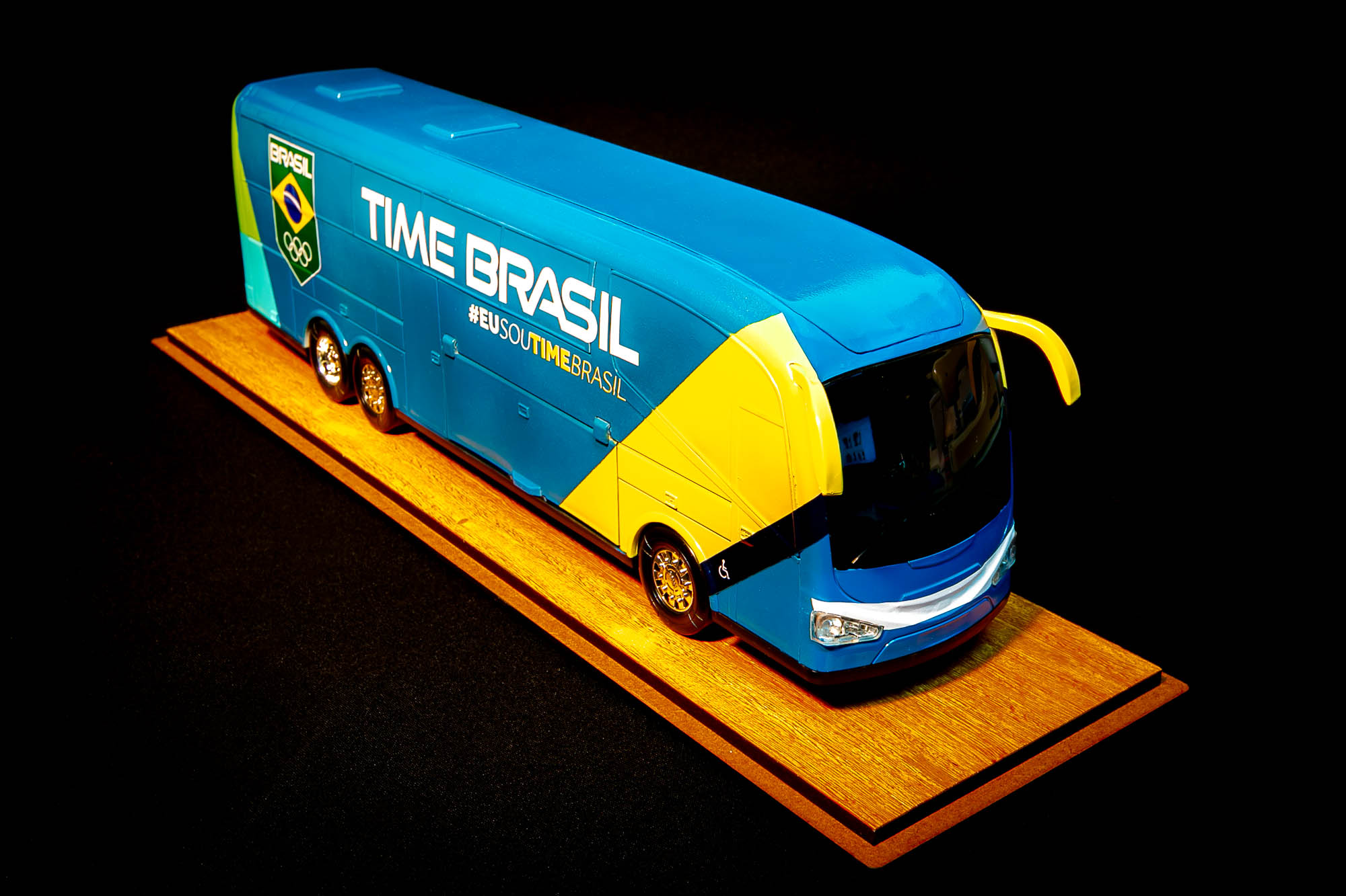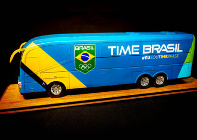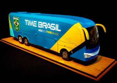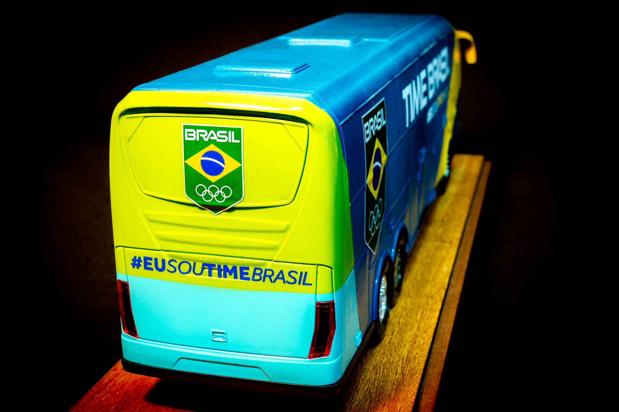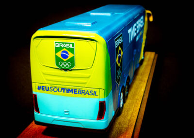 Esta maquete foi desenvolvida para a apresentação da nova identidade visual dos ônibus que transportaram a delegação de atletas durante os Jogos Olímpicos no Brasil. O modelo reproduz com precisão as cores e elementos gráficos oficiais da equipe nacional, simbolizando energia, movimento e orgulho do país.