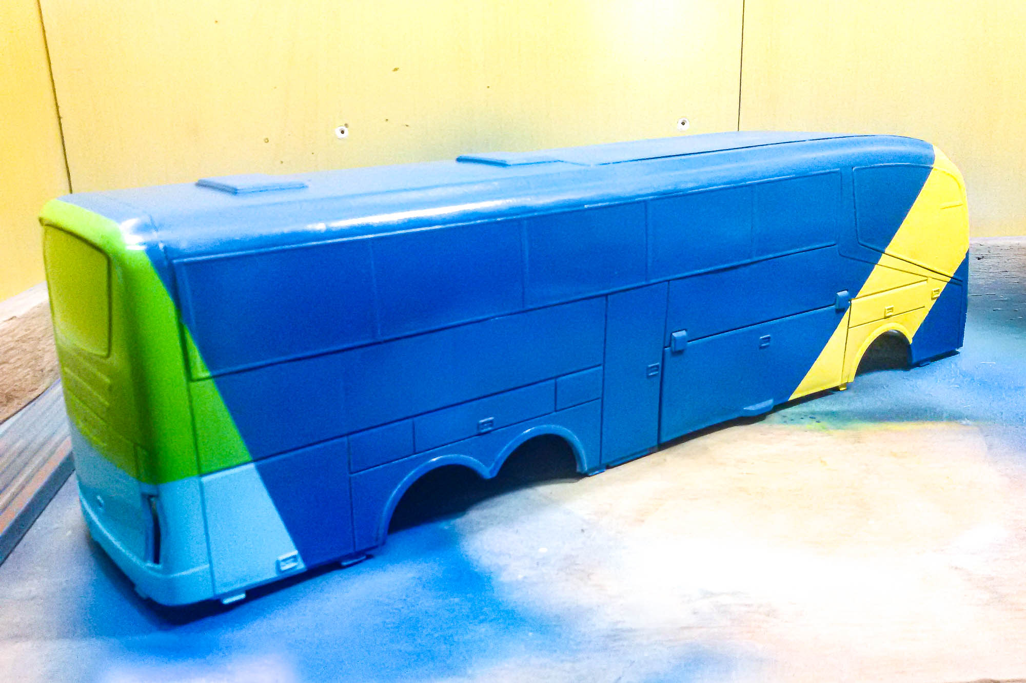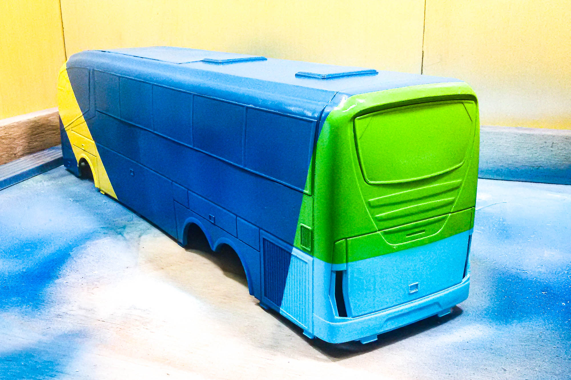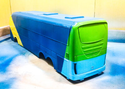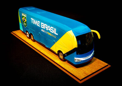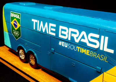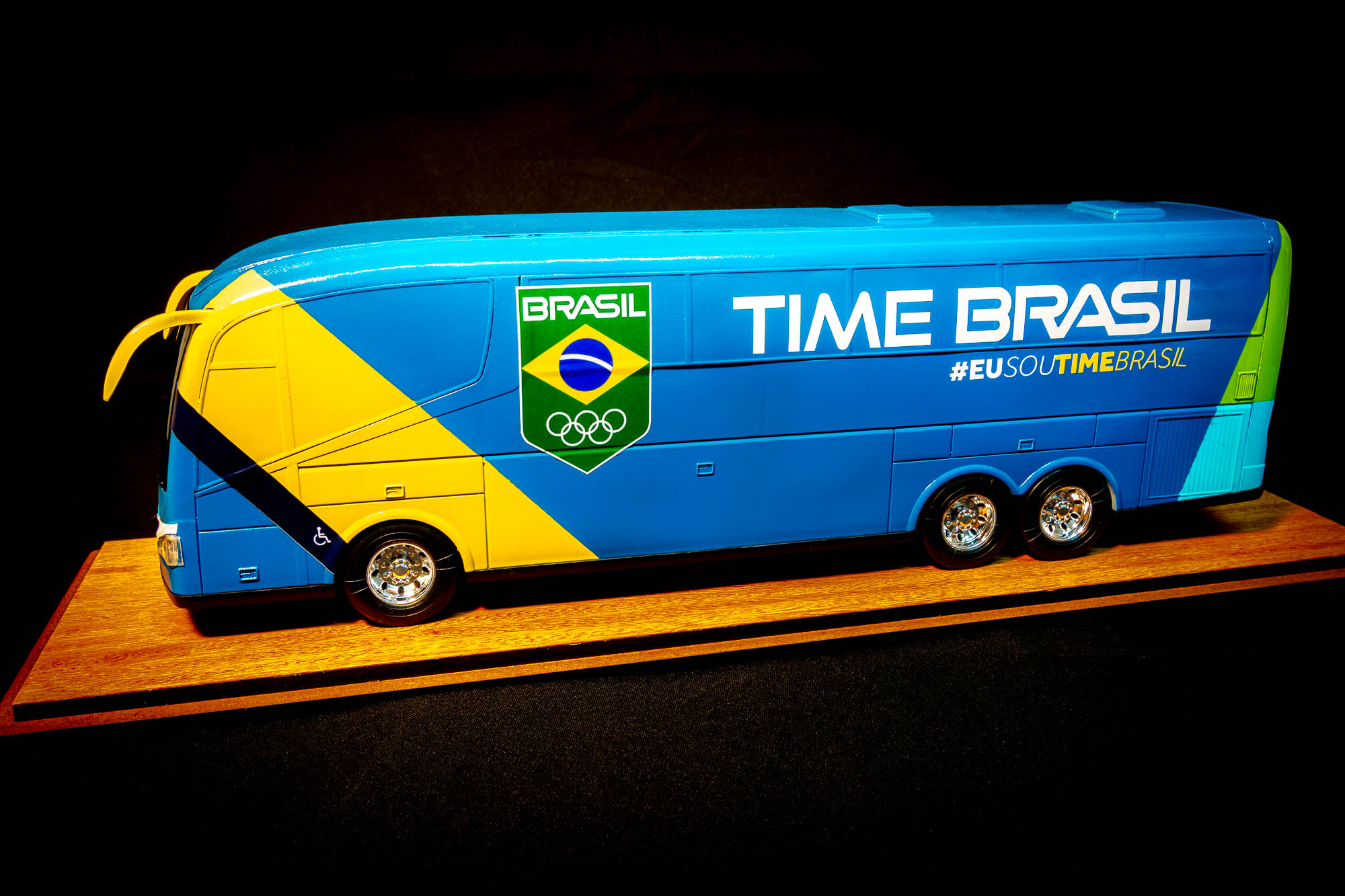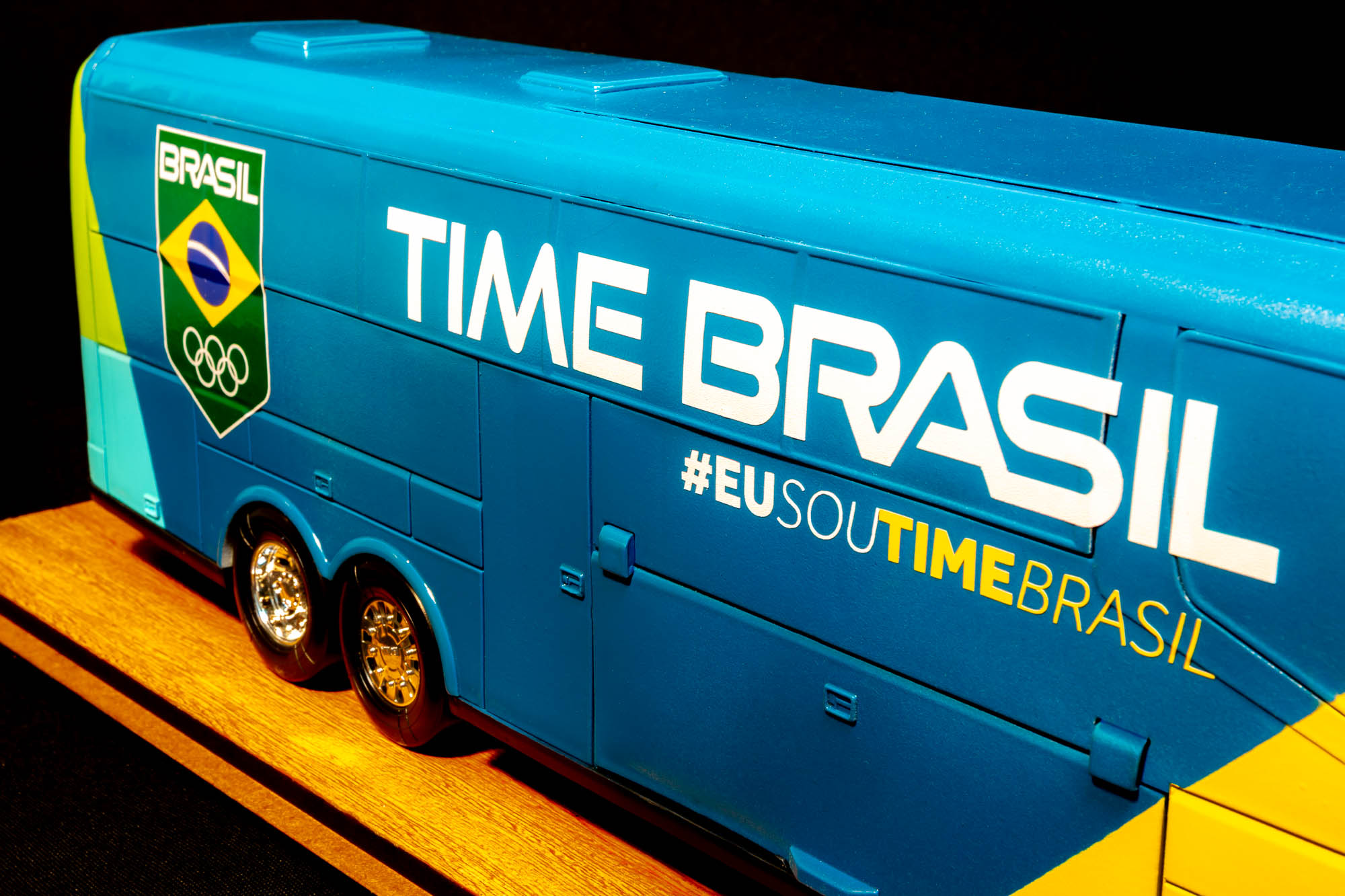 Esta maquete foi desenvolvida para a apresentação da nova identidade visual dos ônibus que transportaram a delegação de atletas durante os Jogos Olímpicos no Brasil. O modelo reproduz com precisão as cores e elementos gráficos oficiais da equipe nacional, simbolizando energia, movimento e orgulho do país.