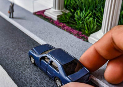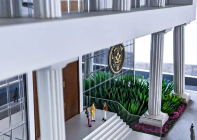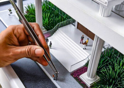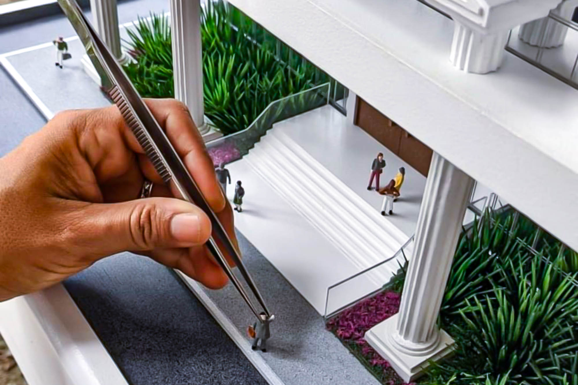 Enquanto isso, no setor de marcenaria e vidraçaria, são produzidas as bases e mesas de apoio, além da instalação dos vidros, que garantem proteção e acabamento. Os sistemas elétricos e de automação, instalados por técnicos especializados, adicionam funcionalidades e movimento à maquete. Na etapa final, a pintura dá o acabamento necessário, e a equipe de humanização aplica vegetação, mobiliário e figuras humanas, conferindo personalidade ao projeto.