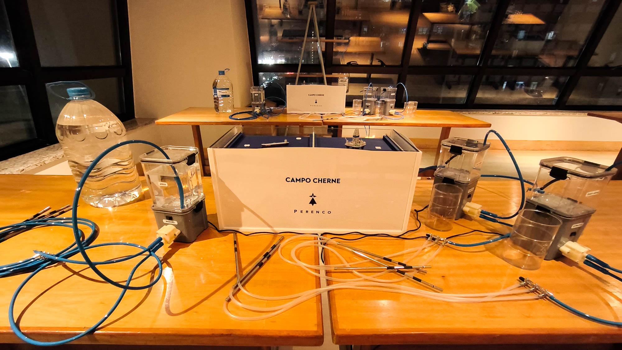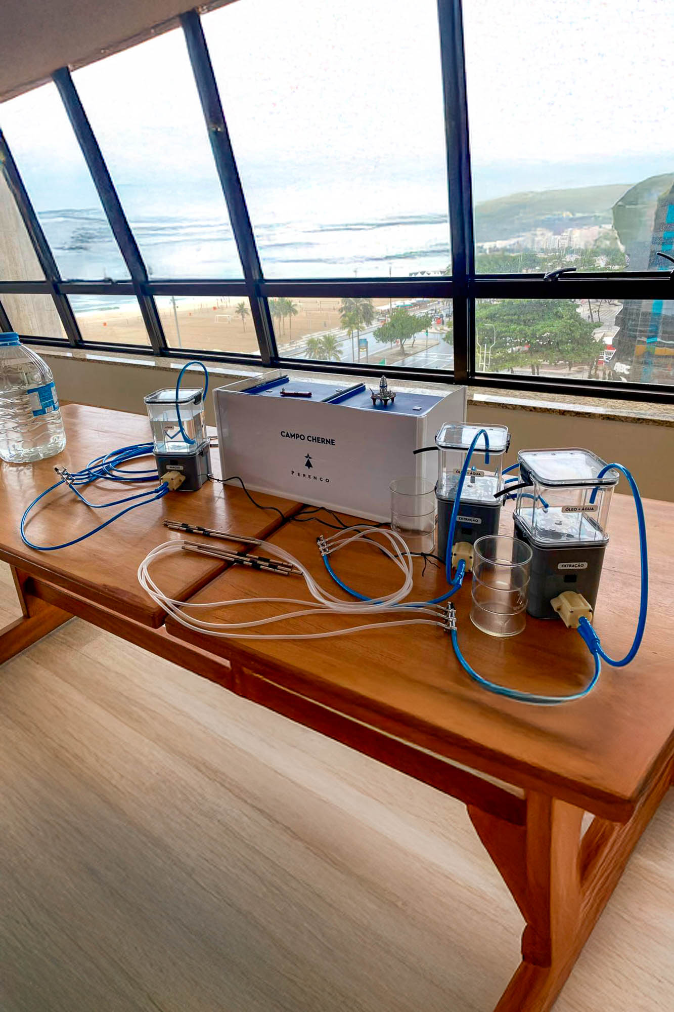 O sistema demonstrava a injeção de água em um poço com óleo, simulando o bombeamento e a separação do produto final em um barril, tornando tangível cada etapa do processo produtivo.